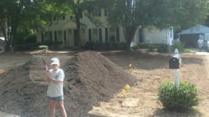 Before and after picture of landscaping grading and sod job.  As well as Daddys little helper! Before After